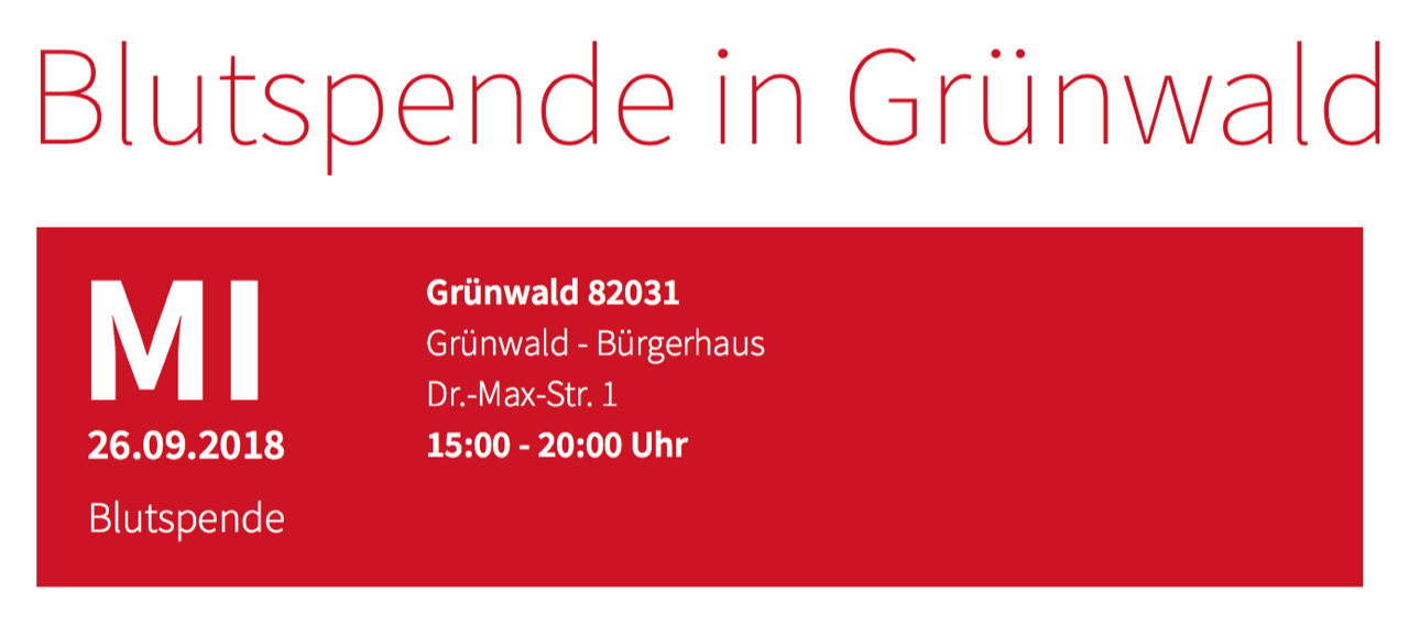 Am kommenden Mittwoch, den 26.09.2018 findet wieder eine Blutspendeaktion in Grünwald statt. Im Zeitraum von 15 bis 20 Uhr stehen wieder die Türen des Bürgerhauses in der Dr.-Max-Straße für Spendewillige offen!