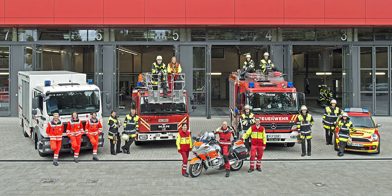 Es brennt! Rauchentwicklung im 2. und 3. Obergeschoß. Menschen in Gefahr! Die kleine Vanessa beobachtet dies und ruft mit ihrem Handy die 112. So beginnt die Vorführung eines gemeinsamen Brandeinsatzes von Feuerwehr und Rettungsdienst. Es ist der Tag der offenen Tür der neuen Schwabinger Feuerwache 4. Hier in der Heßstraße 120 teilen sich die Berufs- und die Freiwillige Feuerwehr München, die Johanniter und das Bayerische Rote Kreuz die großzügigen brandneuen roten Gebäude.