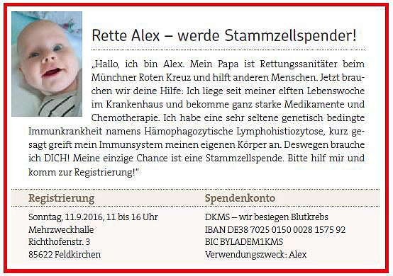 Rette Alex - werde Stammzellenspender! Typisierungsaktion am 11.9.2016 in Feldkirchen