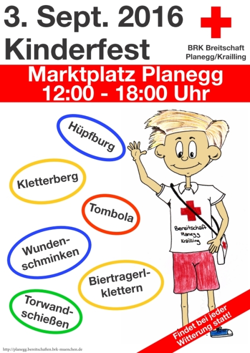 Die Bereitschaft Planegg/Krailling des Münchner Roten Kreuzes veranstaltet am 3. September von 12:00 bis 18:00 Uhr am Marktplatz in Planegg ein Kinderfest. Kinder aller Altersklassen haben die Möglichkeit, sich an verschiedenen Spielstationen den ganzen Nachmittag lang sportlich und kreativ zu beschäftigen.