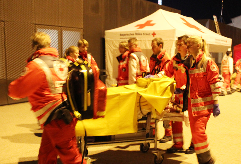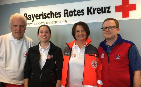 Karl-Heinz Demenat, Vorsitzender des Münchner Roten Kreuzes und Sabine Wagmüller, 1. stv. Vorsitzende, leisteten unterstützt von Corinna Mauermayer (BRK-Bereitschaft Deisenhofen) und Christian Reiter (Bergwacht München) am 1. Wiesnmontag Dienst am Infopoint der Wiesn-Sanitätsstation.