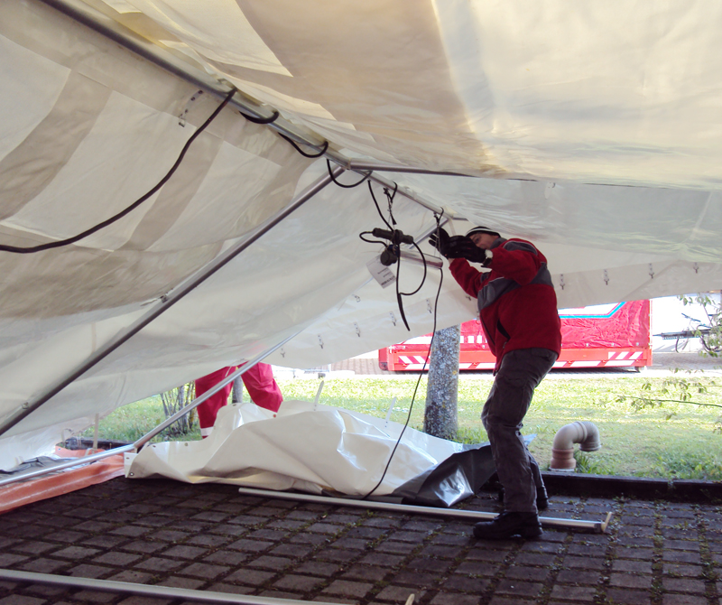 So wird bei Arbeiten wie Materialprüfung, Reinigungs- und Reparaturarbeiten, die einmal im Monat samstags stattfinden, die Privat- und Einsatzkleidung geschont und somit das Budget des Roten Kreuzes entlastet.