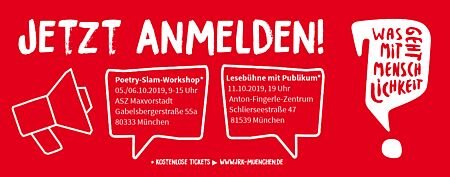 "Was geht mit Menschlichkeit?" heißt die aktuelle Kampagne des Jugendrotkreuzes. Das Münchner Rote Kreuz greift die Kampagne auf und veranstaltet eine Schreibwerkstatt und eine Lesebühne zum Thema Menschlichkeit, dem wichtigsten Grundsatz der Rotkreuz- und Rothalbmondbewegung.