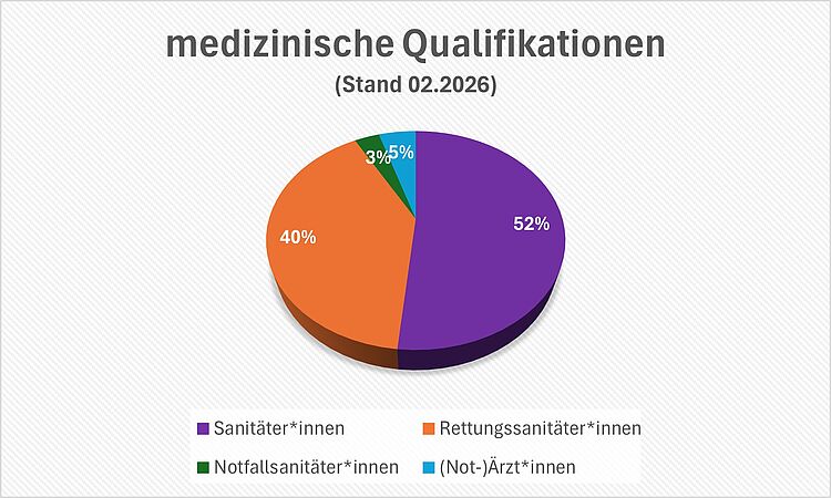 Gerne könnt ihr Euch bei den folgenden Grafiken einen Überblick über die Verteilung der verschiedenen medizinischen und taktischen Qualifikationen unserer Bereitschaft machen. Wobei es sich hier um eine Punktprävalenz vom Februar 2026 handelt und sich die Zahlen durch kontinuierliche Weiterbildung unserer Kamerad*innen stetig ändern.