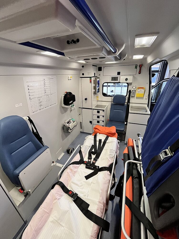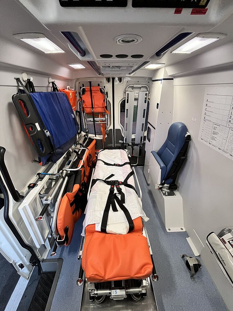Beide KTW sind in der Lage notfalls zwei liegende Patient*innen zu transportieren. Bezüglich der Ausstattung sind beide Fahrzeuge gleich eingeräumt und ausgestattet. Unter anderem führen wir mit: